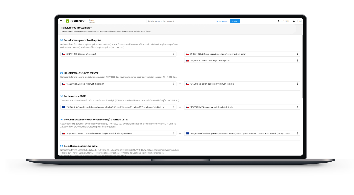 Získáte podrobné srovnání stěžejních rekodifikovaných právních předpisů. Například rekodifikace soukromého práva nebo přestupkového práva.